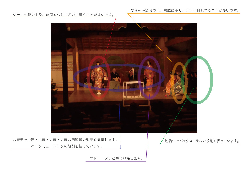 シテ・ワキ・ツレといった舞い手のほか、バックコーラスを担う地謡、バックミュージックを担うお囃子(笛・小鼓・大鼓・太鼓)がいます。